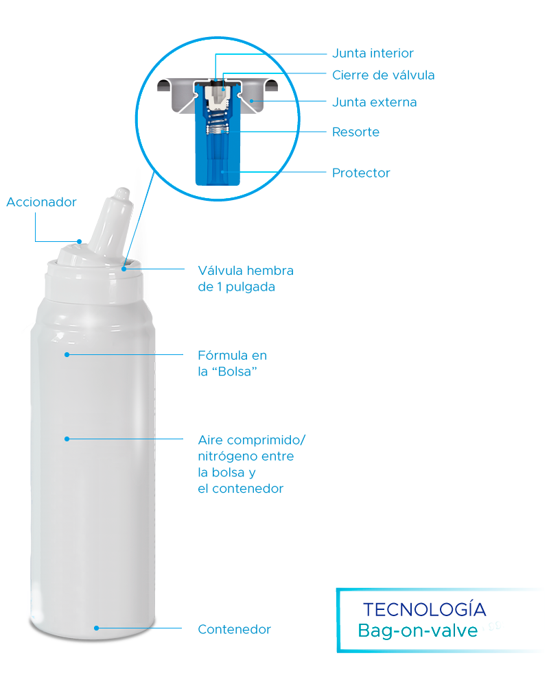 La tecnología Bag-On-Valve (bolsa en válvula) permite mantener la integridad y calidad del Agua de Mar nasal, así como de los componentes bioactivos de